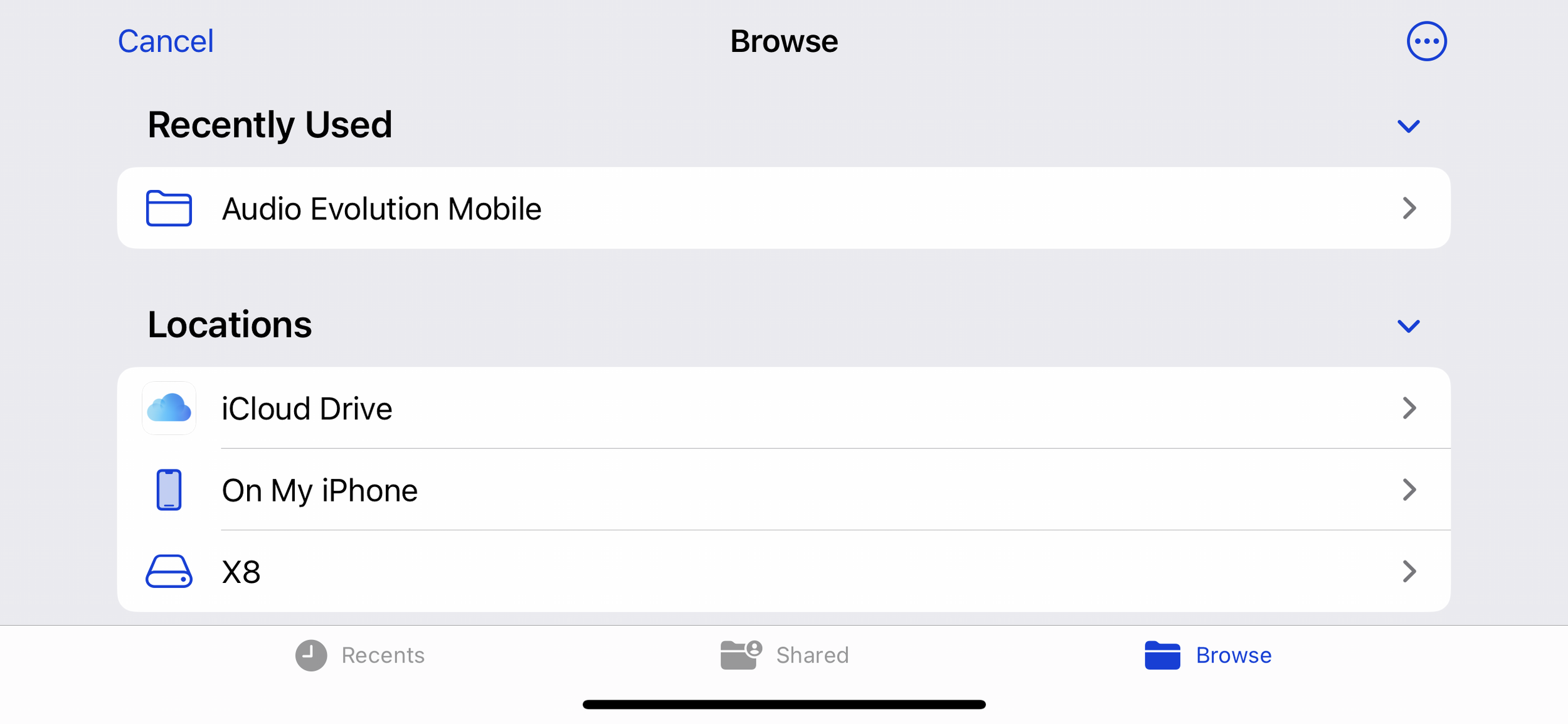 5) On iPhone/iPad, in AEMS, open a new project file. From the same Project folder in upper left corner, choose Import using the Files app (as a plug-in within AEMS). Use Files app to browse to Locations. The x8 will be added to the existing list as in screenshot here. Click on x8, go to SOUND folder, choose your file, click on Open, and be patient especially if it’s a full concert. There is no indicator showing upload time. It,will eventually open your waveform on the screen, and you can edit away.